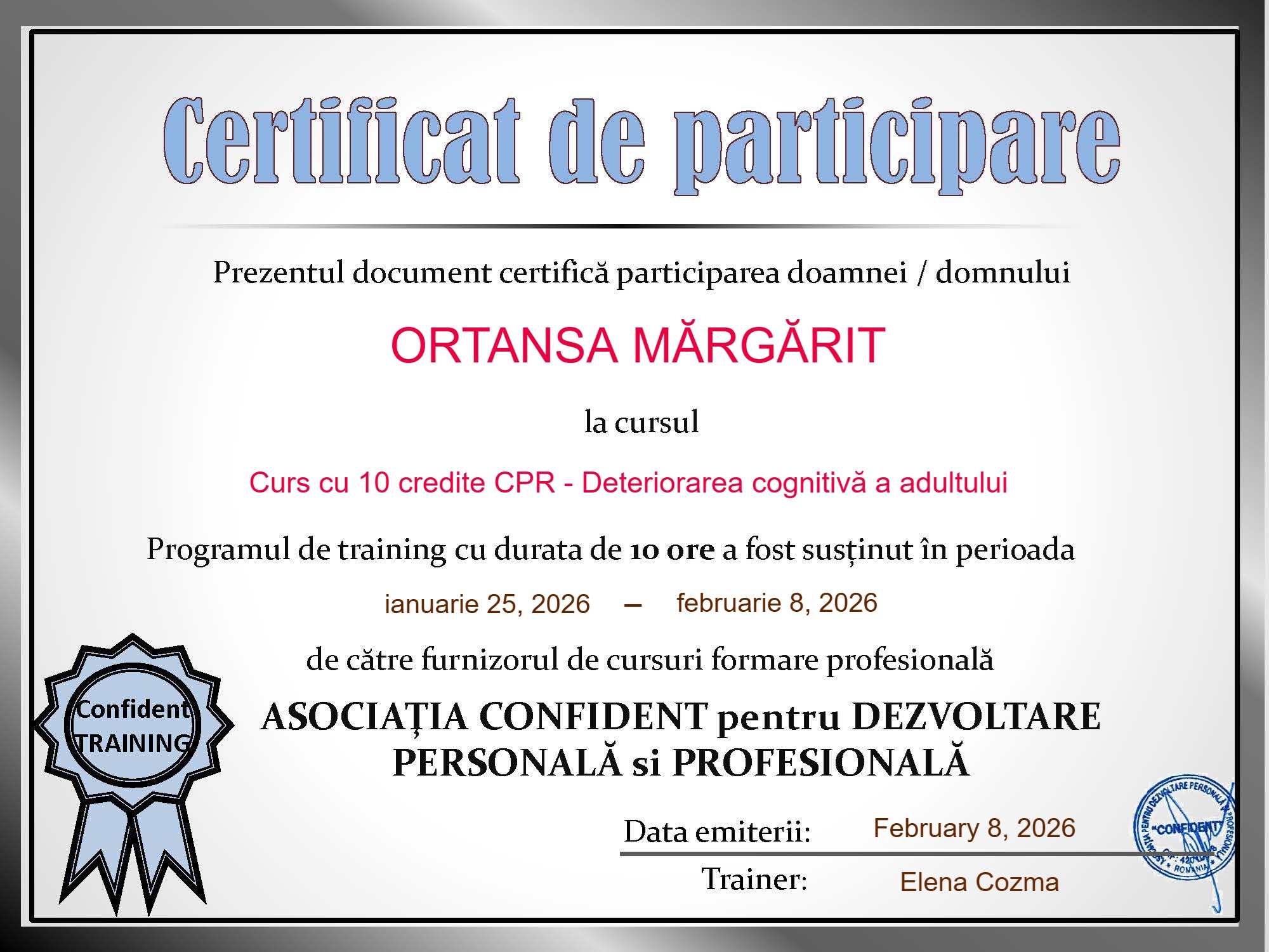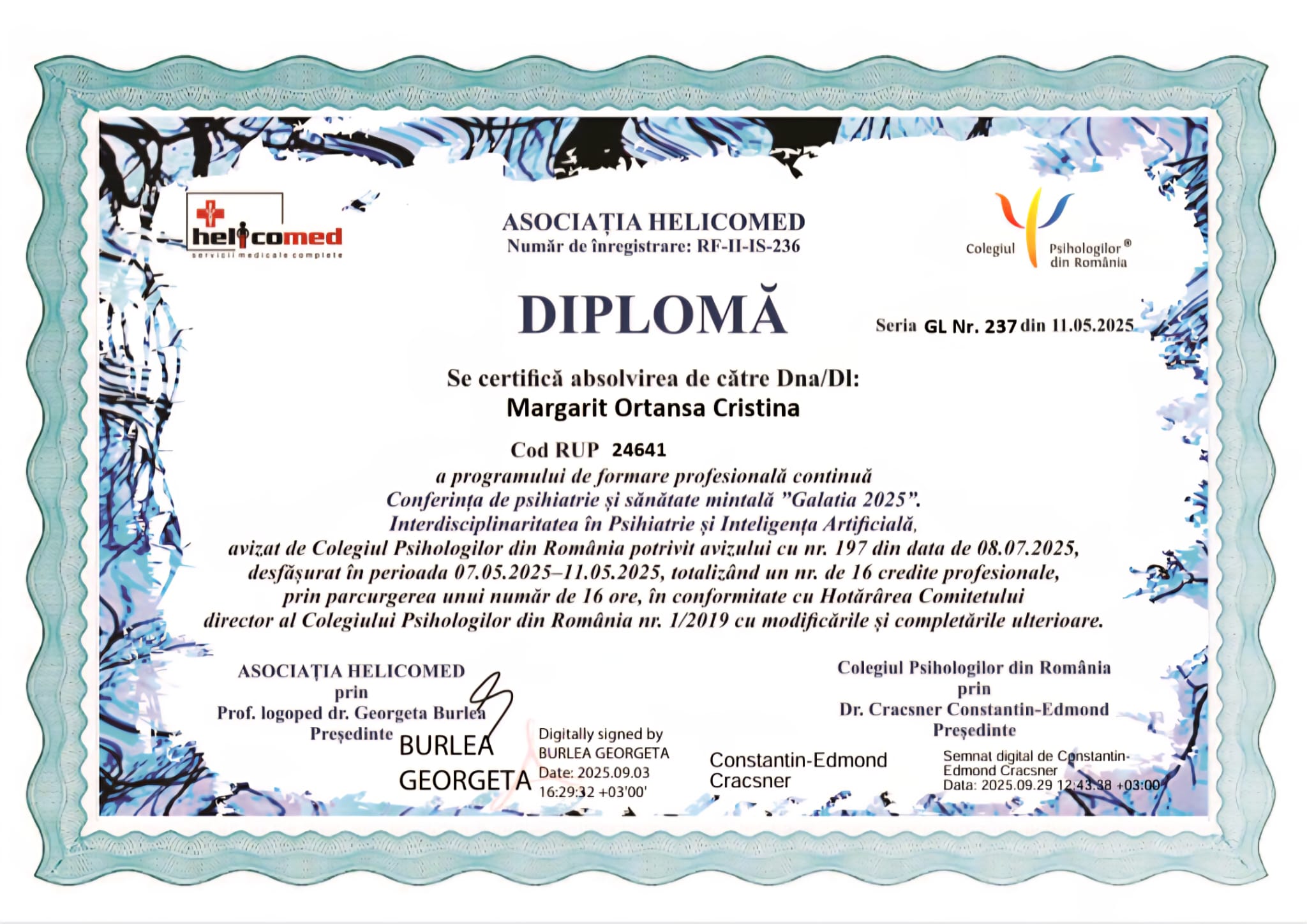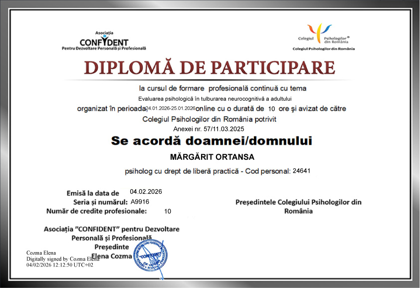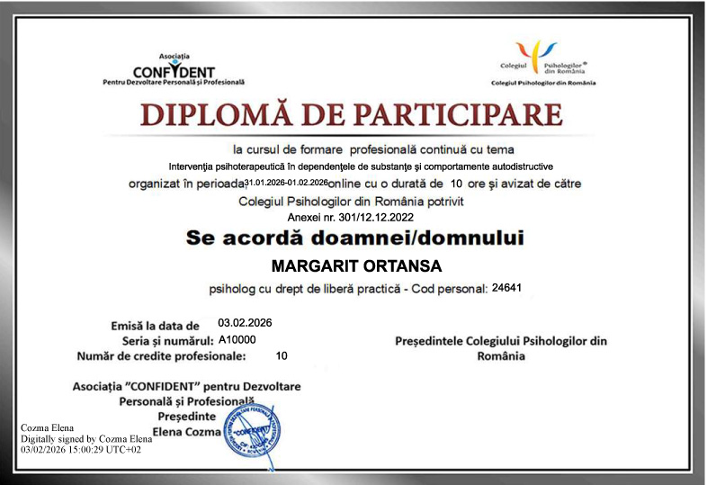 - Pozitie: Psihoterapeut integrativ / psiholog clinician / consilier dezvoltare personală / psiho-oncolog
